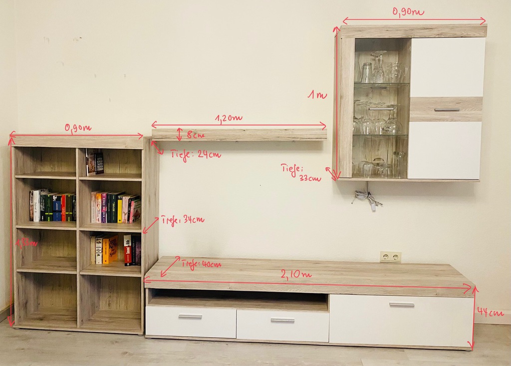 Wohnzimmerwand, Farbe: Eiche-Nachbildung/weiß, bestehend aus